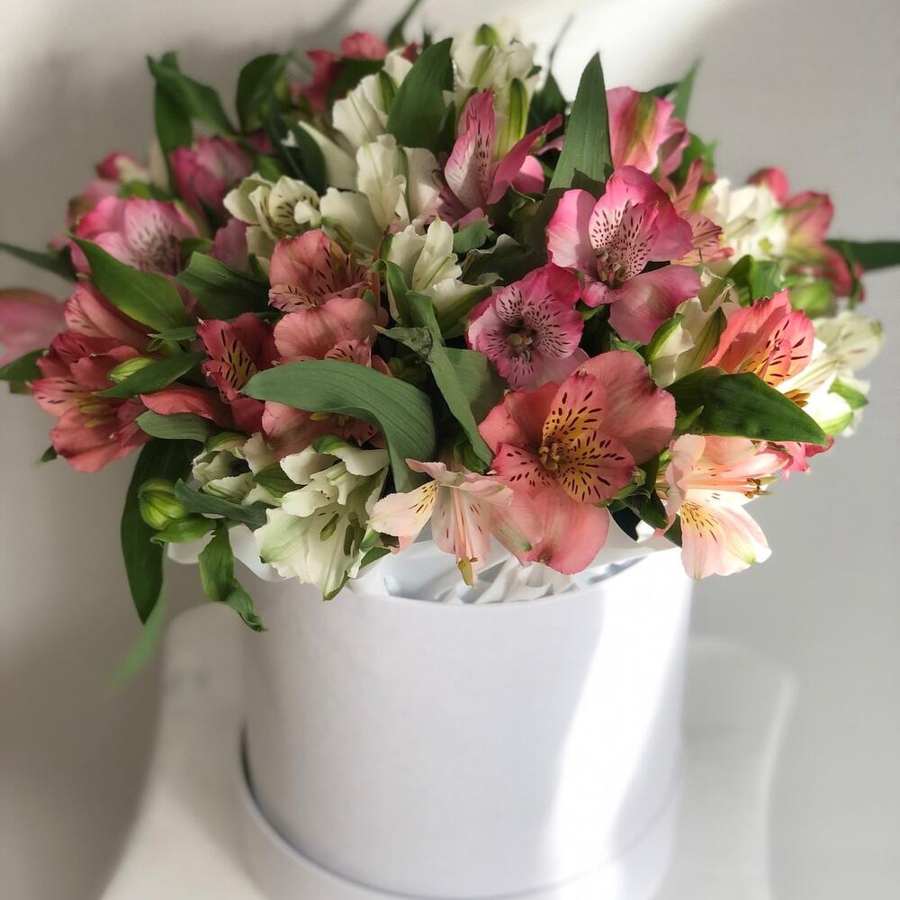 Альстромерия – 11 шт.Упаковка дизайнерская – 2 шт.Коробка шляпная – 1 шт.Пиафлор (оазис) – 1 шт.