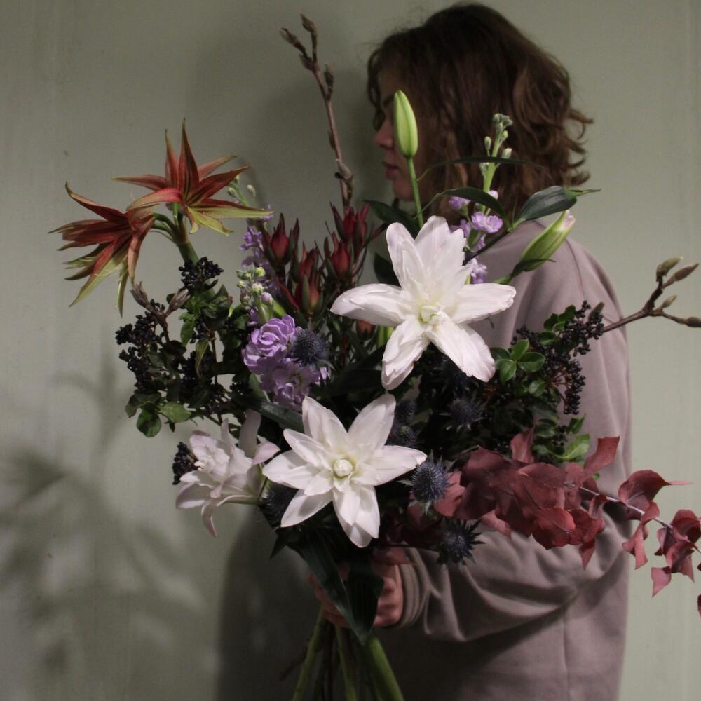 Лилия махровая – 3 шт.Амариллис – 1 шт.левкадендрон – 1 шт.Вибурнум – 3 шт.Эрингиум – 1 шт.Маттиола – 3 шт.магнолия ветка – 2 шт.эвкалипт стабилизируемый – 2 шт.Лента – 1 шт.