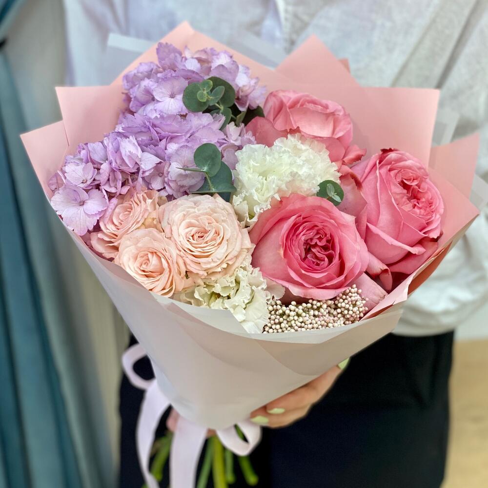 Красивый букет с гортензией и пионовидными розами
