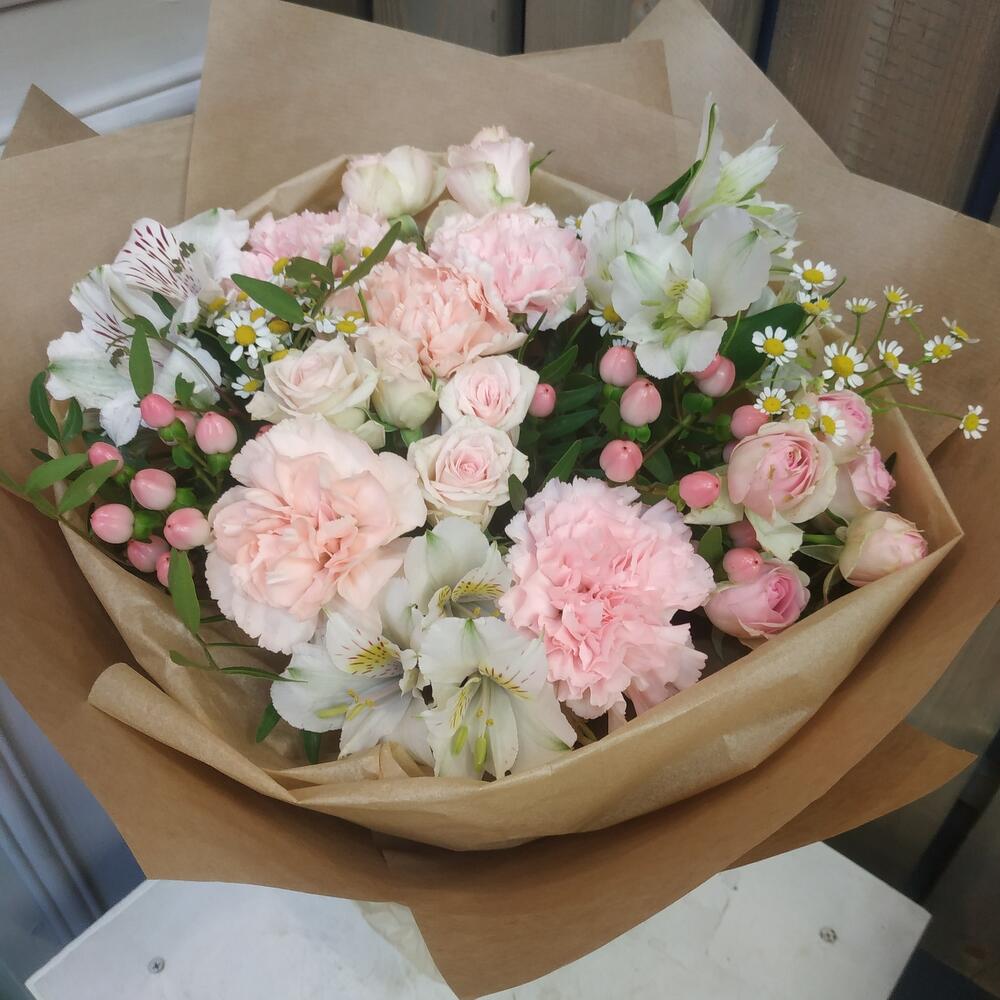 Альстромерии, Гвоздики, Кустовые розы, Лизиантусы, Розы, Хризантемы